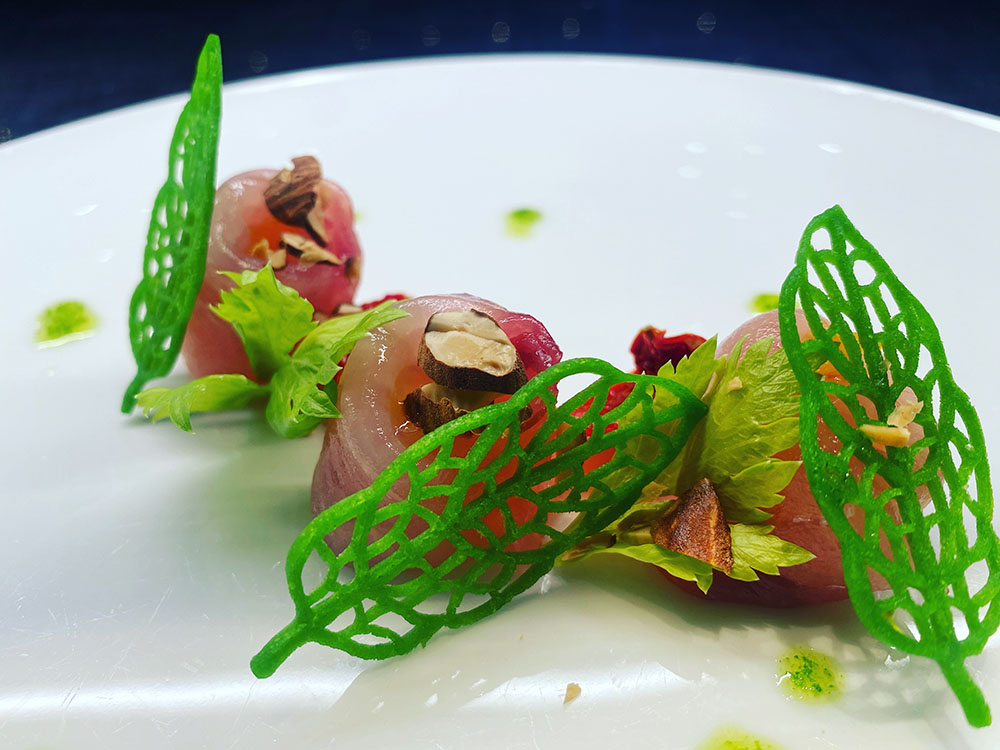 Spada affumicato, marmellata piccante di mandarini e mandorle tostate